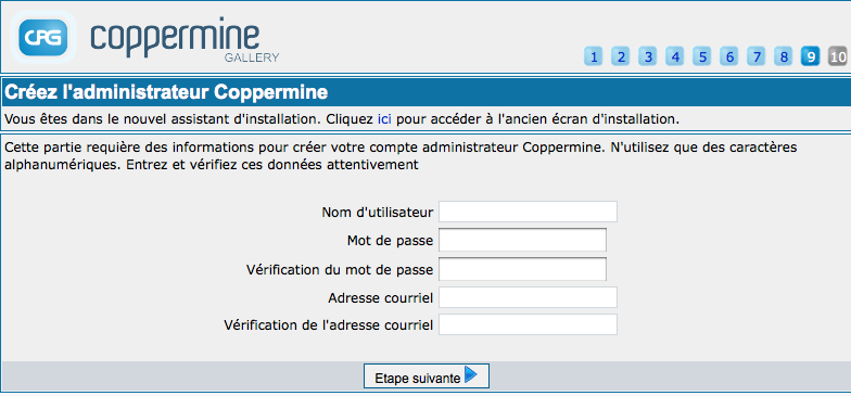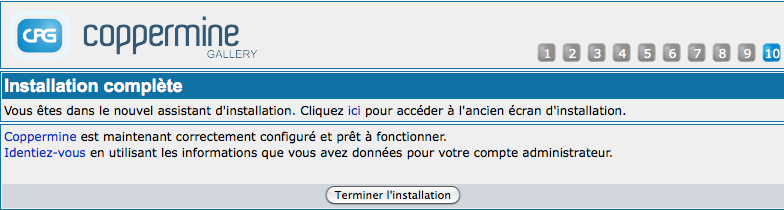 Depuis cpg1.5.x Coppermine utilise un assistant d'installation qui vous guide à travers la totalité du processus d'installation. Ci-dessous vous trouverez les étapes de l'assistant d'installation, avec un chapitre par étape.