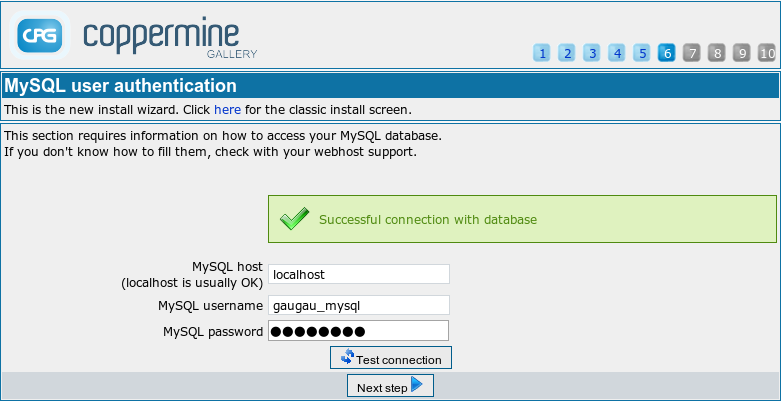 You need to specify Underneath the input fields you will find a button to test the connection - if you click that button, a test is performed to see if the data you have entered is correct. If it is, a message that says "Successfull connection to database" will be displayed (see screenshot), and you can continue to the next step. If the test is not successfull, you will need to review your mySQL authentification settings.